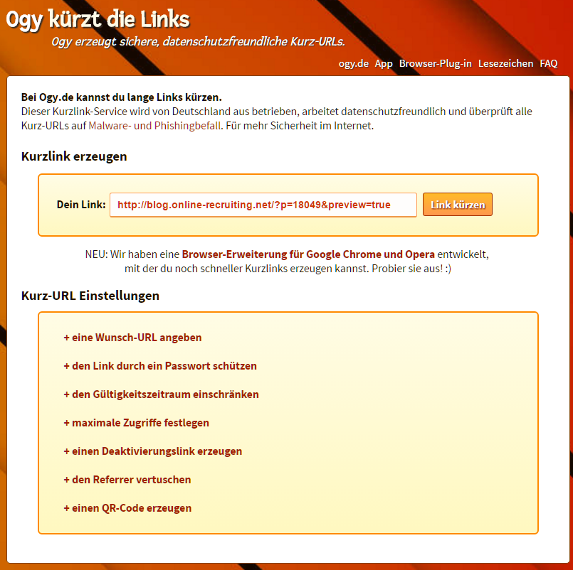 Da empfiehlt es sich, das Link-Verkürzer Tool aus Deutschland zu verwenden, das da auf den Namen ogy.de (besonders kurze URL schon im Stamm, was ja Sinn und Zweck der Sache ist) hört.