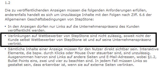 A propos StepStone: dort wurde noch einmal an den AGB gebastelt und der gestrichene Punkt 1.2 wieder hinzugefügt, allerdings in anderem Wortlaut. Eine wohl unendliche Geschichte.