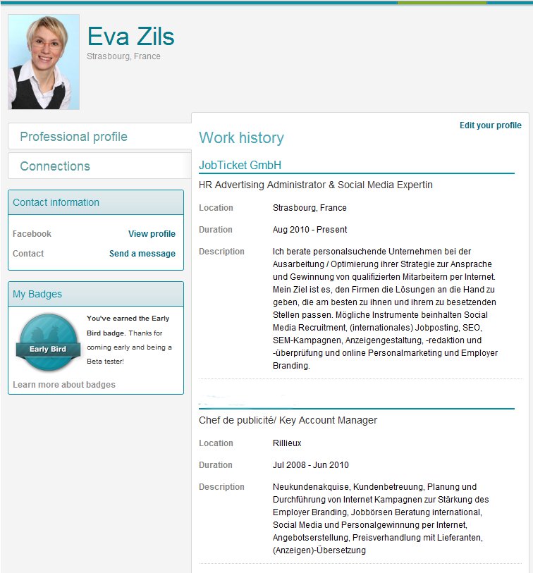Was macht BraveNewTalent aus, dass es sich für die Investoren lohnt, Kapital zu geben? Zunächst ermöglicht es Bewerbern, den teilnehmenden Unternehmen ein ausschließlich auf Karriere getrimmtes Profil zu zeigen. Bei der automatischen Erstellung des Jobsucher Profils werden bestimmte Daten aus den Facebook Angaben gezogen: Wohnort, bisherige Arbeitgeber und die berufsbezogenen Informationen, die vom Nutzer auf Facebook hinterlegt worden sind. Auf den ersten Blick werden also keine wilden Party-Fotos, peinliche Kommentare oder Diskussionen für Recruiter angezeigt. Einen Link zum gesamten Facebook-Profil gibt es dennoch… Daher bitte weiterhin auf die Privatsphäre Einstellungen achten! Ein Beispiel-Profil sehen Sie hier rechts (zum Vergrößern bitte auf das Bild klicken).