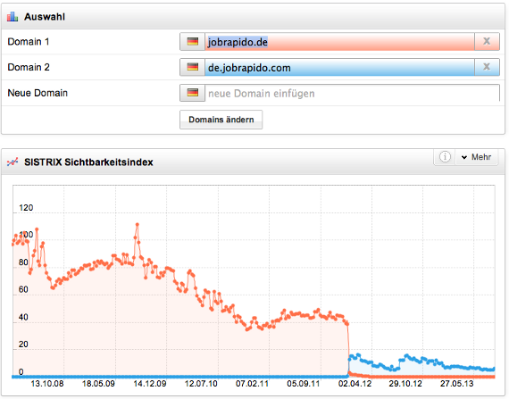 Auffallend: jobrapido.de ist seit Dezember 2011 aus dem Index herausgerutscht und taucht dann nicht mehr auf. Allerdings wurde die Domain Anfang 2012 auf de.jobrapido.com umgestellt (s. Grafiken unten). Das muss um den Zeitraum geschehen sein, als Jobrapido im April 2012 von Evenbase übernommen worden war. Seitdem entwickelt sich die Sichtbarkeit eher langsam und organisch – der deutsche Markt scheint für die Briten noch nicht in Angriff genommen worden zu sein….?