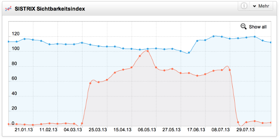 So schnell kann’s gehen: Gerade noch im siebten SEO-Himmel und sehr gut bei Google gerankt, die monatlichen Besucherzahlen sind zwischen Juni 2012 und Juni 2013 um 124 Prozent gestiegen, und plötzlich ist indeed.de in den Sistrix– und SEOlytics Sichtbarkeitsindices stark abgefallen, genau genommen seit Ende Juli.