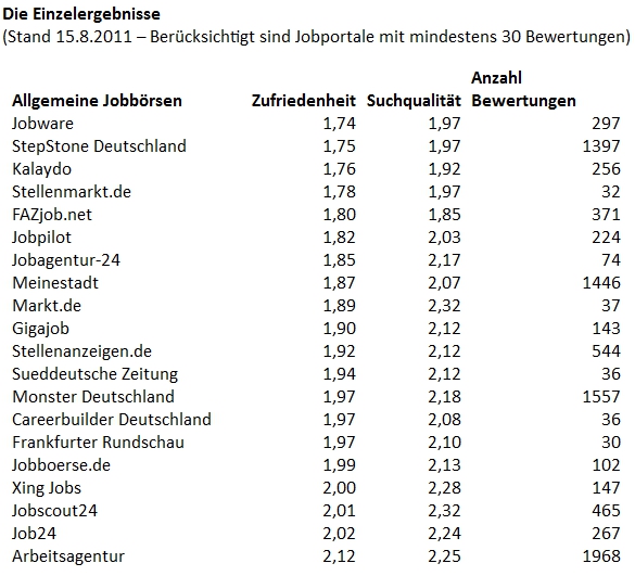 Insgesamt fällt die Jobbörsen Bewertung für alle recht gut aus. Unter den Schlusslichtern befinden sich die Bundesagentur für Arbeit (nicht wirklich überraschend), Job24 (???) und die kürzlich von Careerbuilder übernommenen Münchner JobScout24.de. An den Ergebnissen merkt man in der Tat, dass das neue Gespann Careerbuilder-Jobscout24 noch Arbeit vor sich hat, wie ich bereits beschrieben hatte (s. vorheriger Link).