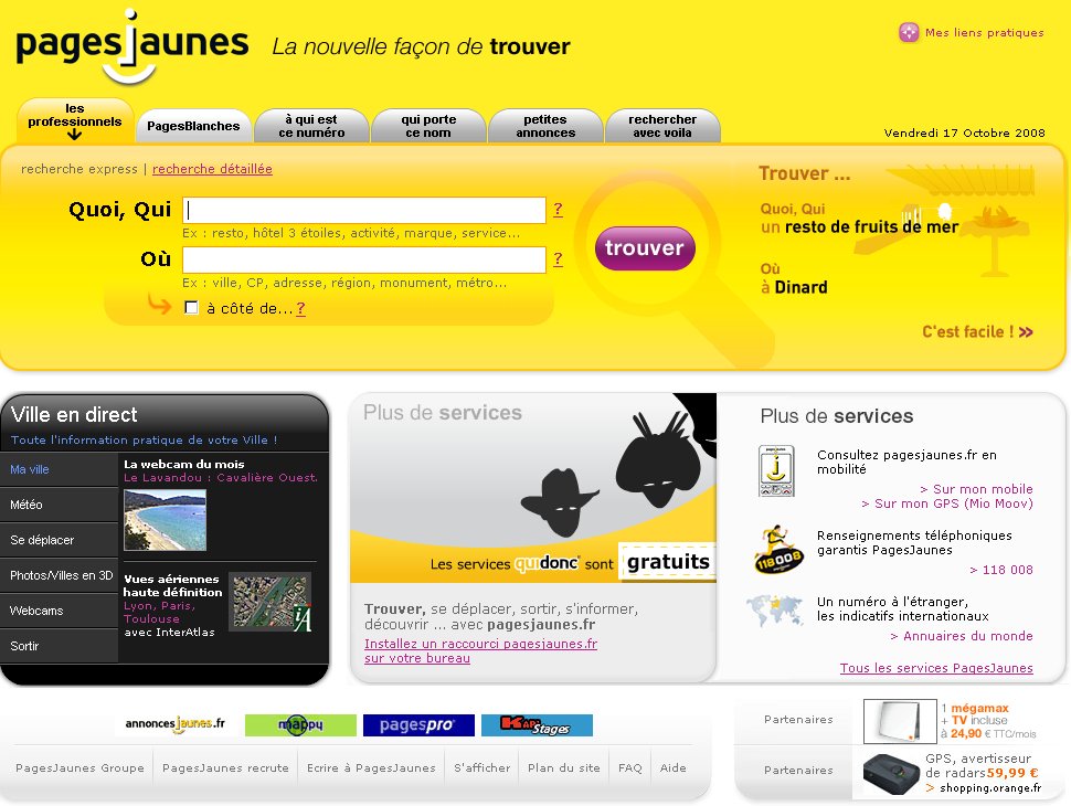 Nun ja, das neue Jobtrack-Layout, das an die Gelbe Seiten erinnert (hier der Ausschnitt der französischen Pages Janues), kann marketingtechnisch auch recht sinnvoll sein: Gelbe Seiten (oder, wenn ich mich nicht täusche, das hollädische Pendant, Gouden Gids, werden genutzt, um Unternehmensadressen zu finden und für die Arbeitssuche, Jobtrack. So gesehen, schlau gemacht 😉