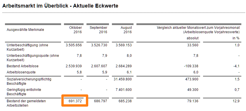 Laut der Bundesagentur für Arbeit waren also diesen Oktober 691.372 offene Arbeitsstellen gemeldet. Diese offenen Stellen sind nicht nur diejenigen, die beim Arbeitsamt und dessen eigener Jobbörse zu finden sind, sondern auch andere Vakanzen. In der Beschreibung des BA-Stellenindex steht: