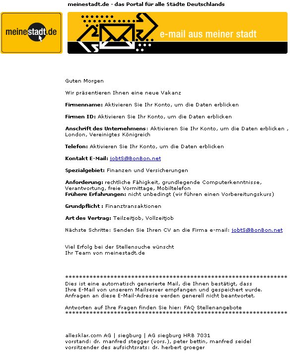 Heute morgen erhielt ich eine seltsame E-Mail mit dem Betreff “Teilzeit-Job”. Der Absender klang mit “Mitchell Thacker” bereits SPAM-Filter würdig, und die Maildomain (nenne ich hier nicht) noch mehr. Das Mail-Layout war mit Logos, Bildern und Angaben des meinestadt.de Corporate Design aufgemacht. Daraufhin sendete ich eine E-Mail an meinestadt.de, die darauf umgehend reagiert haben (Lob an die Kommunikation!).