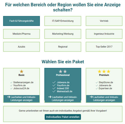 Kunden können aus 26 vorgefertigten Paketzusammenstellungen wählen, welche speziell auf die Zielgruppe und das vorhandene Budget zugeschnitten sind. Preislich liegen die einzelnen Pakete (Ausbildungsstellen einmal außen vor gelassen) zwischen 990 € und 2.290 € und bieten dem Kunden einen Preisvorteil gegenüber Einzelschaltungen von bis zu 70% der addierten Listenpreise.