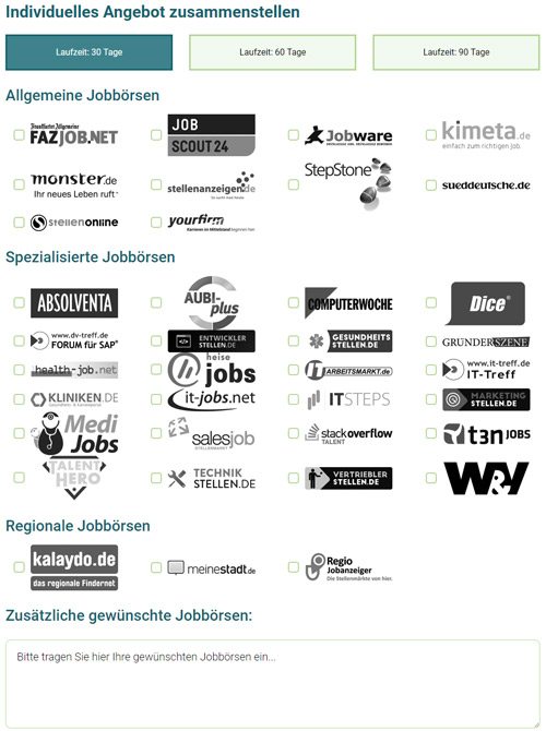 Wer bei den vorgefertigten Paketen nicht fündig wird, kann sich auch ganz individuelle Pakete zusammenstellen. Der Besucher hat dabei die Wahl zwischen 37 verschiedenen Jobbörsen, die bei Laufzeiten von 30, 60 oder 90 Tagen beliebig miteinander kombiniert werden können. Das ergibt insgesamt, ziemlich genau… eine ganze Menge Kombinationsmöglichkeiten.