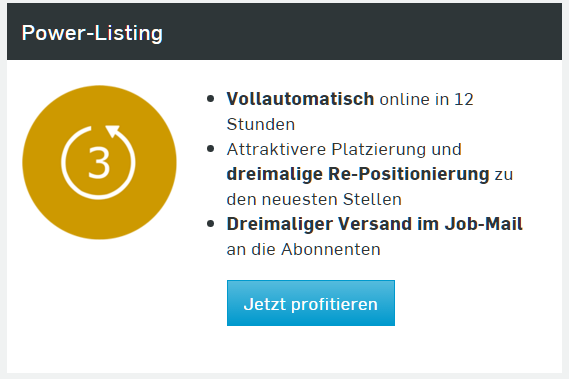 Aber bei 100.000 Jobs geht der eine und vor allem auch der andere Job mal schnell im Datenwust verloren. Also kann man Reichweiten- und Highlightprodukte dazu kaufen. Diese sind im Vergleich zu klassischen, kommerziellen Jobbörsen günstiger. Bei 100000jobs.ch liegt das so genannte “Power Listing” bei schlappen 260 CHF: