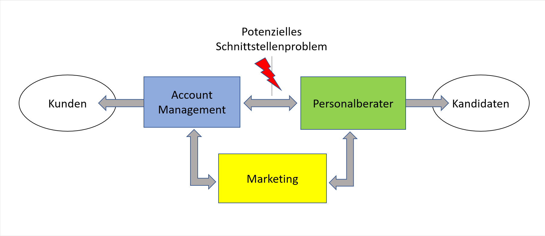 Potenziell problematisch dabei war jedoch ein im Hintergrund schwelendes Schnittstellenproblem zwischen den Abteilungen Account Management und Personalberater. Probleme, die dort entstanden, waren mangelnder Kommunikation sowie der Verfolgung jeweils getrennter Abteilungsziele geschuldet. Natürlich haben wir an diesen Problemen gearbeitet. In gemeinsamen Workshops wurden Konzepte für ein besseres Informationsmanagement erarbeitet und Prozess-Schritte und Ergebnisse in einem inhouse entwickelten CRM transparent für alle dargestellt. Das alles hat Abhilfe geschaffen, das Grundproblem jedoch nicht lösen können.