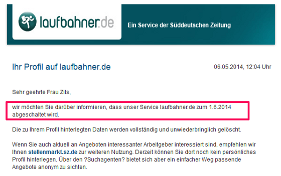 Das von der Süddeutschen Zeitung im Mai 2009 gelaunchte Karrieretool und Employer Branding Portal Laufbahner wird zum 01.06.2014 abgeschaltet.