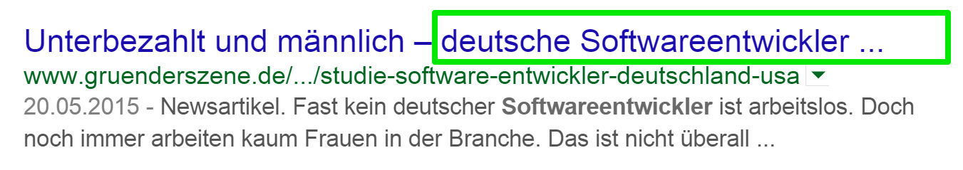 Seitdem wird in Pixel gemessen – vorher ging man von der Faustregel aus, dass ein Titel oder eine Überschrift nicht länger als 60 Zeichen sein sollte! Da aber Schriftzeichen unterschiedlich breit sind – man vergleich zum Beispiel die Breite eines “i” mit der eines “w” – stellen Pixel eine einheitliche Größe dar.