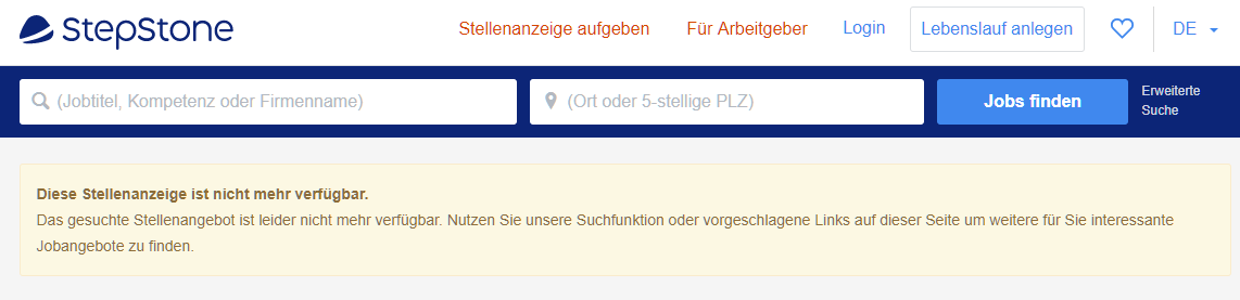 Bei allen relativ “jungen” Jobs, die ich in Jobfeed mit Verlinkung auf StepStone angeklickt habe, erschien folgende Seite: