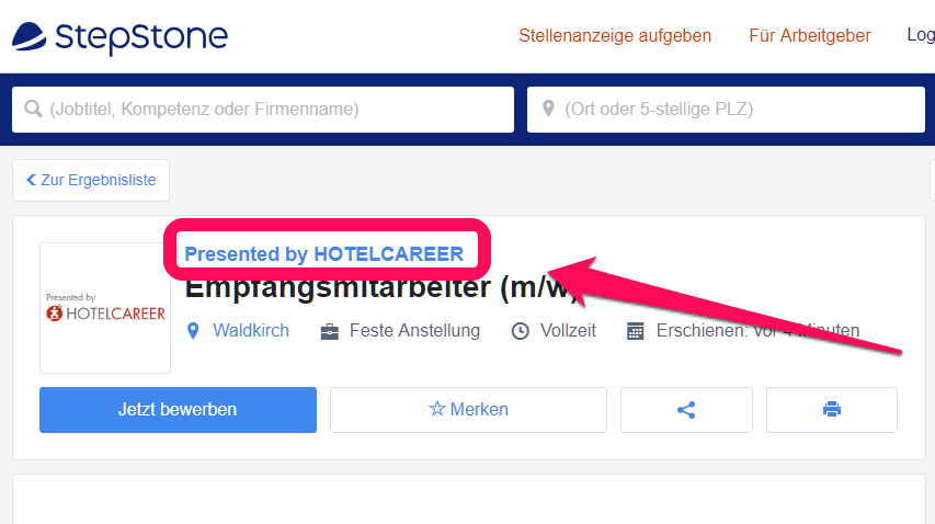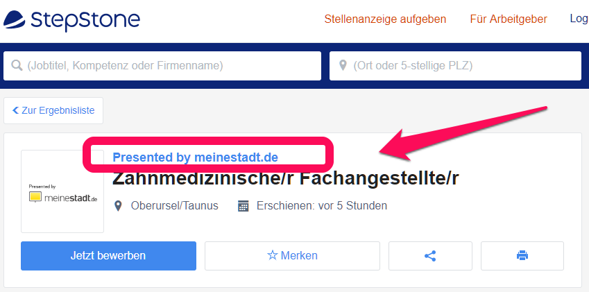 Ansonsten ist mir bei StepStone einiges Interessantes aufgefallen: Als ich prüfen wollte, wie sich die neue meinestadt.de-StepStone.de Kooperation gestaltete, stieß ich auf Anzeigen, die mit “presented by Hotelcareer” betitelt wurden. Das Gleiche fand ich ebenfalls für meinestadt.de-Anzeigen mit “presented by meinestadt”.